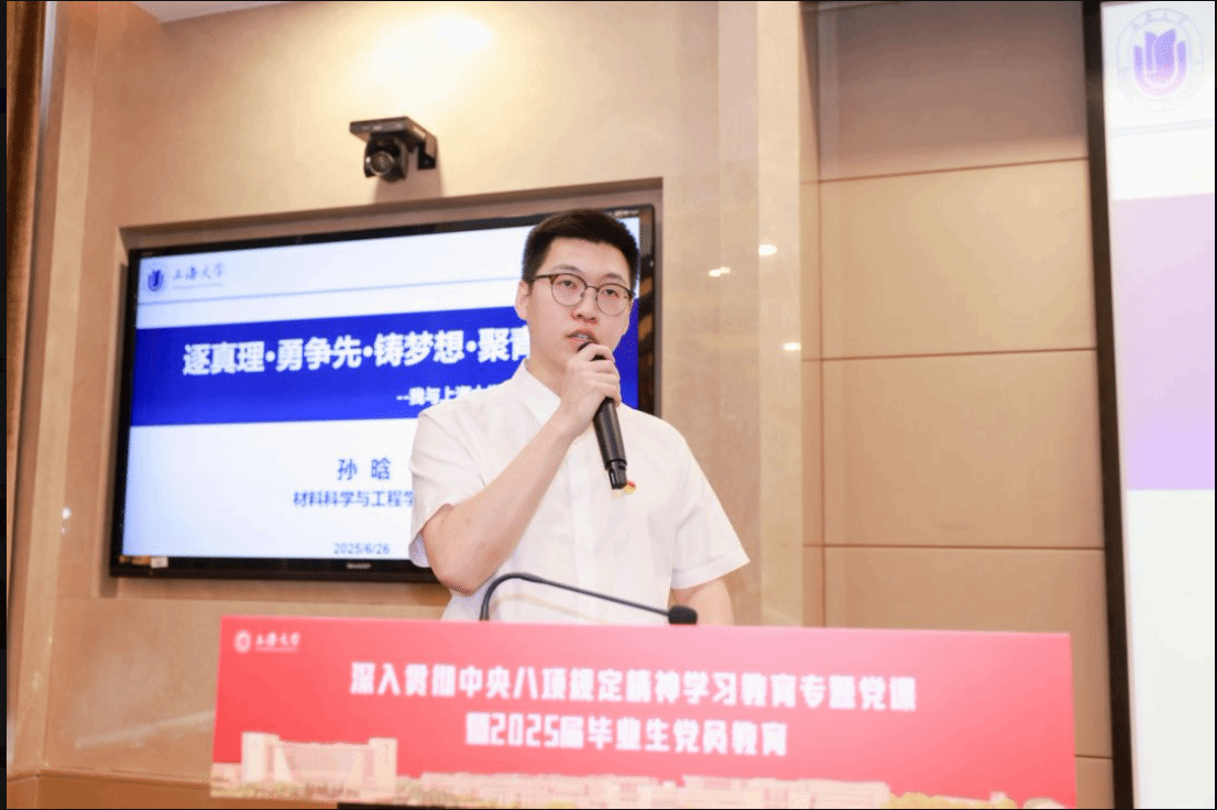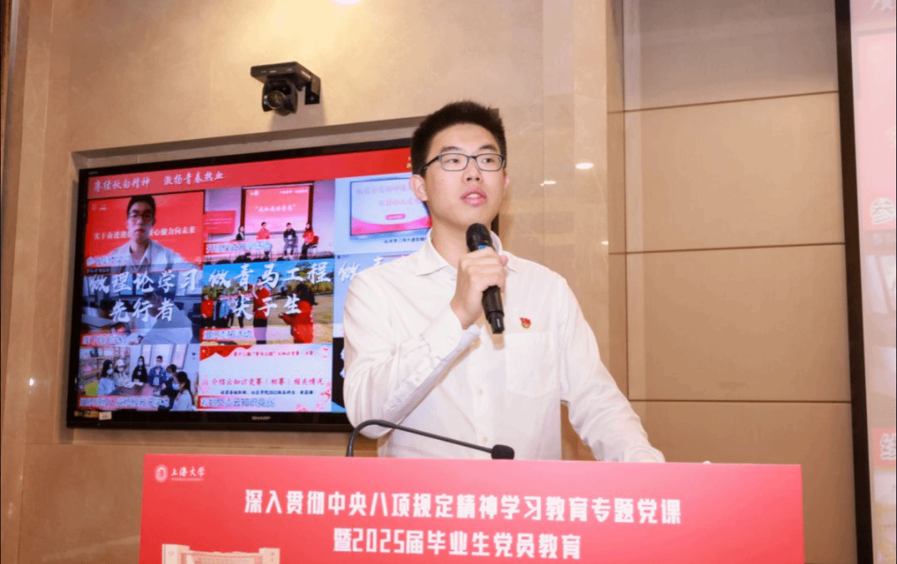 三名优秀毕业生党员代表围绕在学业生涯锤炼党性作风、彰显党员担当的自身经历进行微演讲。上海市优秀毕业生、本科生共产党员、社会学院2021级本科生黄焱堰以“赓续秋白精神,激扬青春热血”为主题,讲述自己从上大泮池到祖国西部的成长轨迹,以专业视角回应时代命题,以深学笃行发扬瞿秋白精神,未来他立志服务西部教育事业,用行动诠释“强国有我”的誓言。