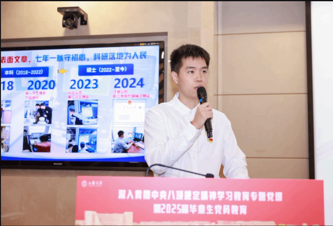 上海市优秀毕业生、研究生“优秀党员先锋”、生命科学学院2022级硕士研究生李晨阳以“初心”为笔,绘守护之梦,他立足专业潜心钻研,成功实现老年服务产品从“0”到“1”的技术突破,将前沿科技转化为守护银发群体的温暖力量,推动科研成果从“纸上”走进“市场”惠及大众,用实际行动诠释青年党员坚守初心追求、扎根基层的担当。